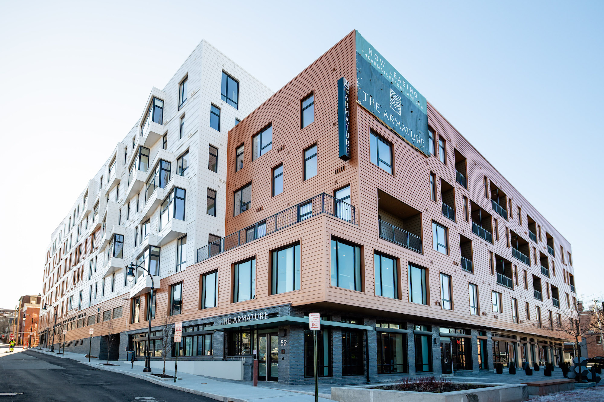 Designed by Boston-based architecture and interiors firm CUBE 3, and constructed by Maine-based Penobscot General Contractors, The Armature showcases a U-shaped, three-tiered exterior configuration and will feature a living wall running along Parris Street.